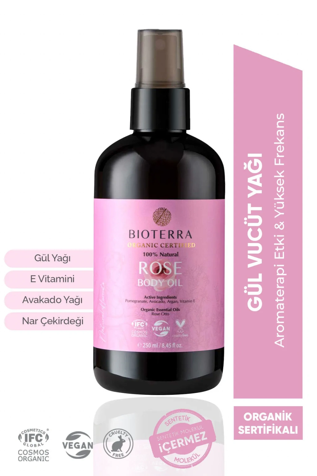 Gül Vücut Yağı 250ml (Rose Body Oil)•Açıklama: Cildi besleyici, pürüzsüzleştirici ve yenileyici etkileri vardır. ; Muhteşem kokusuyla kendinizi gül bahçesinde hissedeceksiniz. ; Masajlarda kullanımı uygundur.•Öne Çıkan İçerikler: Gül Ekstraktı, Argan Yağı, Avakado Yağı, Nar Çekirdeği Yağı ile zenginleştirilmiştir. ; •Uygulama: Vücuda masaj yaparak uygulayınız. ; Organik Sertifikalı;