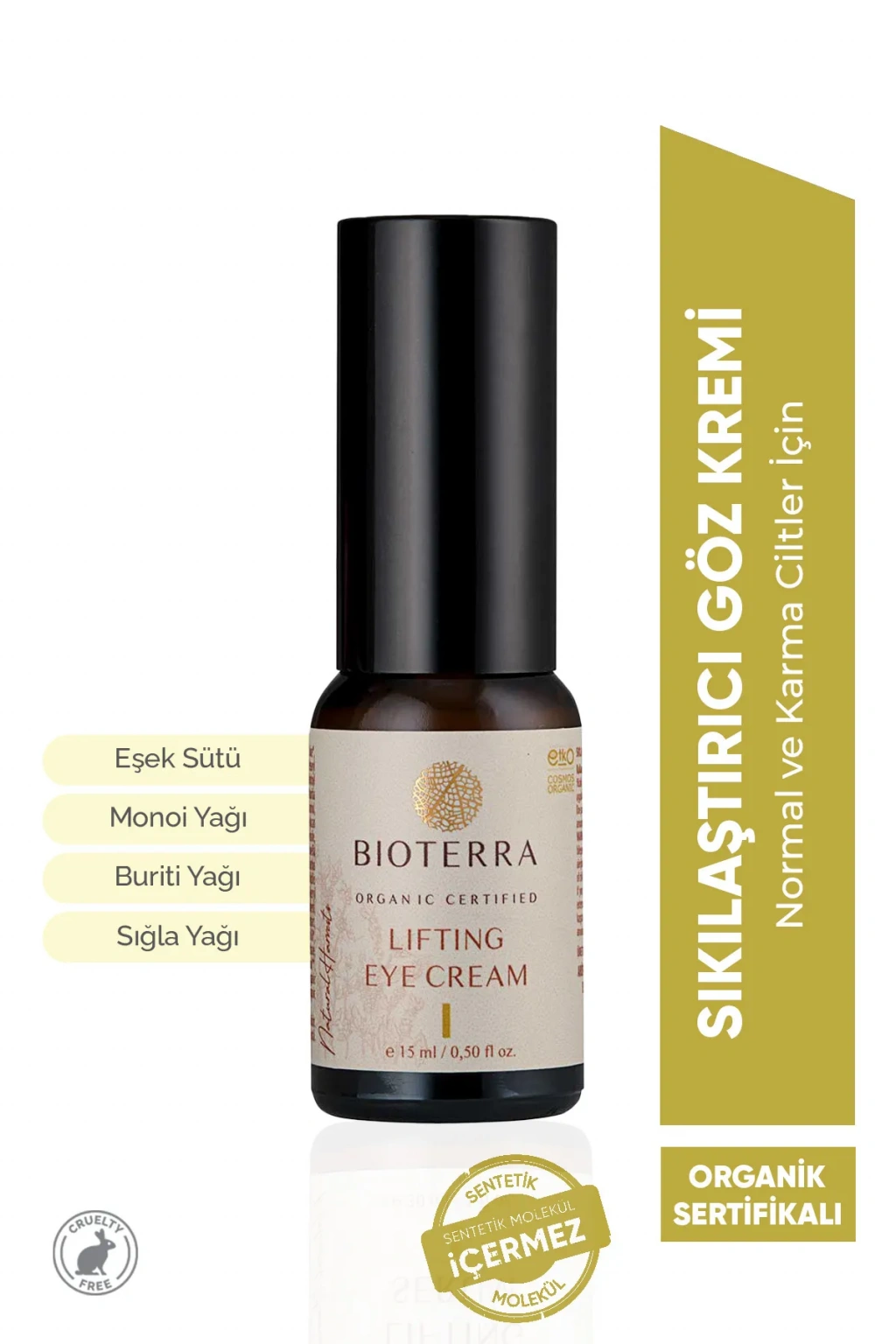 Sıkılaştırıcı Göz Kremi - Tüm Cilt Tipleri İçin •Açıklama: Göz çevresi için özel olarak geliştirilmiş, sıkılaştırıcı ve elastikiyet sağlayıcı bir göz kremidir. Hücrelerin geçleşmesini destekler. Elastin liflerini güçlendirmeye ve dokuların elastikiyetini artırmaya yardımcı olarak cildi sıkılaşmasını destekler ve göz çevresi zamanla daha sıkı bir görünüm kazanır. •Cilt Tipi: Tüm Cilt Tipleri İçin •Öne Çıkan İçerikler: Eşek Sütü, Aloe Vera, Monoi Yağı, Prebiyotik, Buriti Yağı, Hindistan Cevizi Yağı, Konjac, Sığla Yağı, Frenk Üzümü. •Uygulama: Hassas ve ince göz için her iki göz için bir pompa ürün yeterlidir. Yüzük parmağı ile göz çevresine c harfi yaparak uygulanır. Sabah ve akşam uygulanır. Toplam içeriğin % 100’ü doğal kaynaklıdır ve organik tarım ile elde edilmiştir. İÇERMEZ! Sls, Sles, Silikon, Paraben, Parafin, Sülfat, Fosfat, Vazelin, Talk Pudrası, Mineral Yağ, Petrol türevi kimyasal maddeler içermez. Organik Sertifikalı